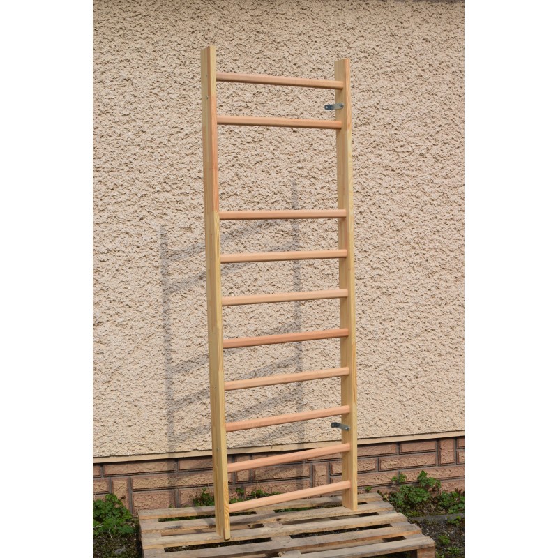 Drabinka gimnastyczna bukowo-sosnowa. Boki drabinki klejone drewno sosnowe II gatunek, wykonane z krótkich lameli, mogą posiadać przebarwienia drewna,